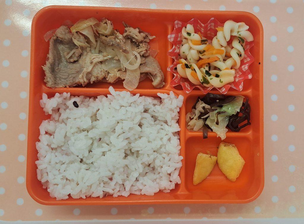豚肉の生姜焼き・マカロニサラダ・キャベツと木耳のごま油炒め・ポテトフライ