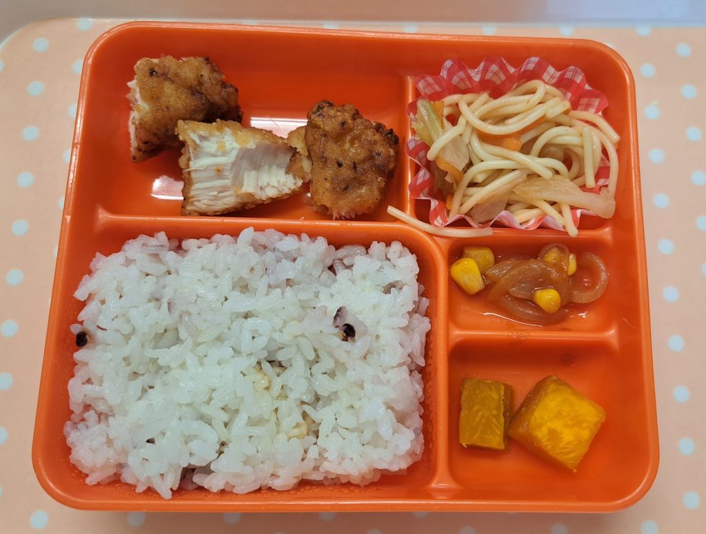 唐揚げ・焼きそば・玉ねぎとコーンのケチャップ煮・かぼちゃの煮物