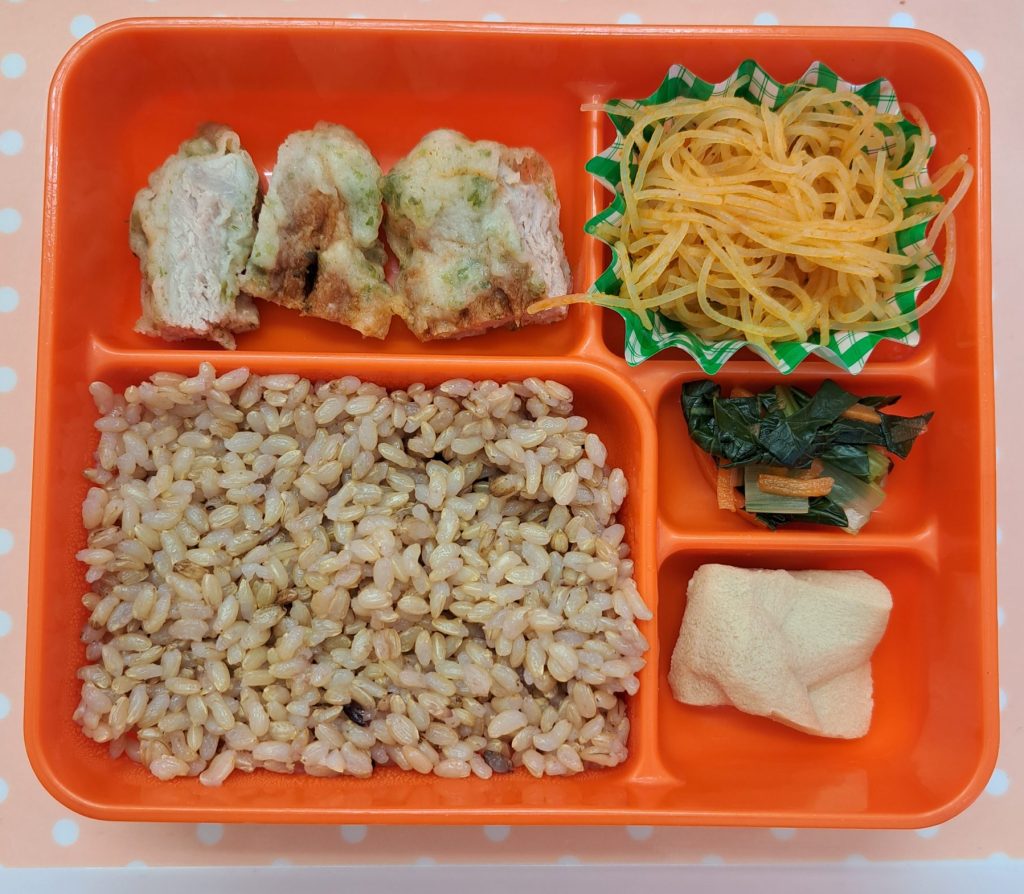 ★豚肉の磯部揚げ、カレー春雨 小松菜と人参の和え物、高野豆腐の煮物