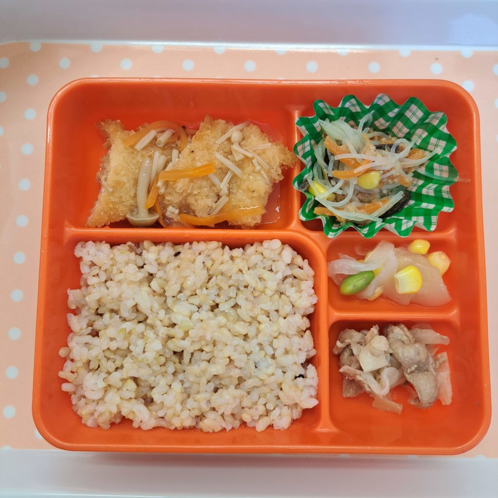 ★白身魚のきのこあんかけ、春雨中華、枝豆、コーン、玉ねぎの炒め物、豚肉とキャベツの炒め物