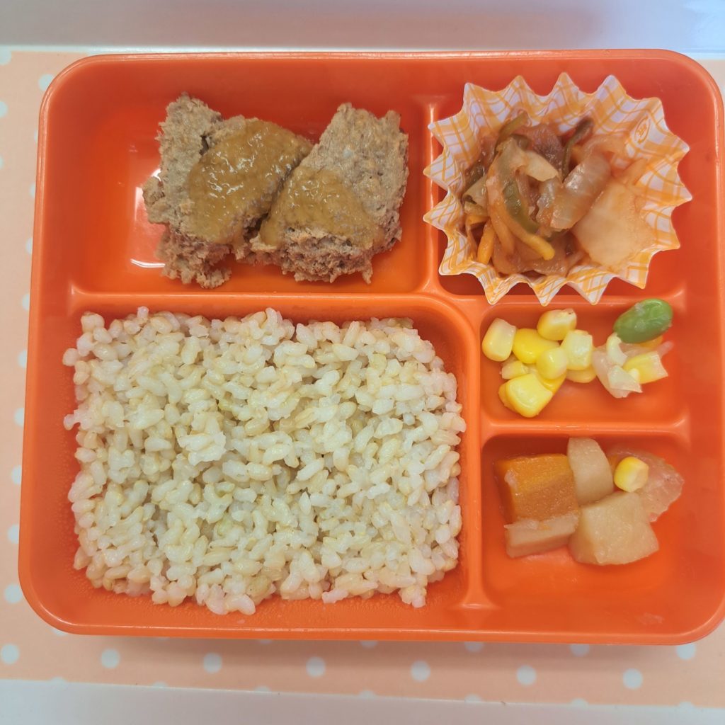 ★和風ハンバーグ、じゃが芋と人参の煮物 枝豆コーン玉ねぎ炒め、野菜のトマト煮