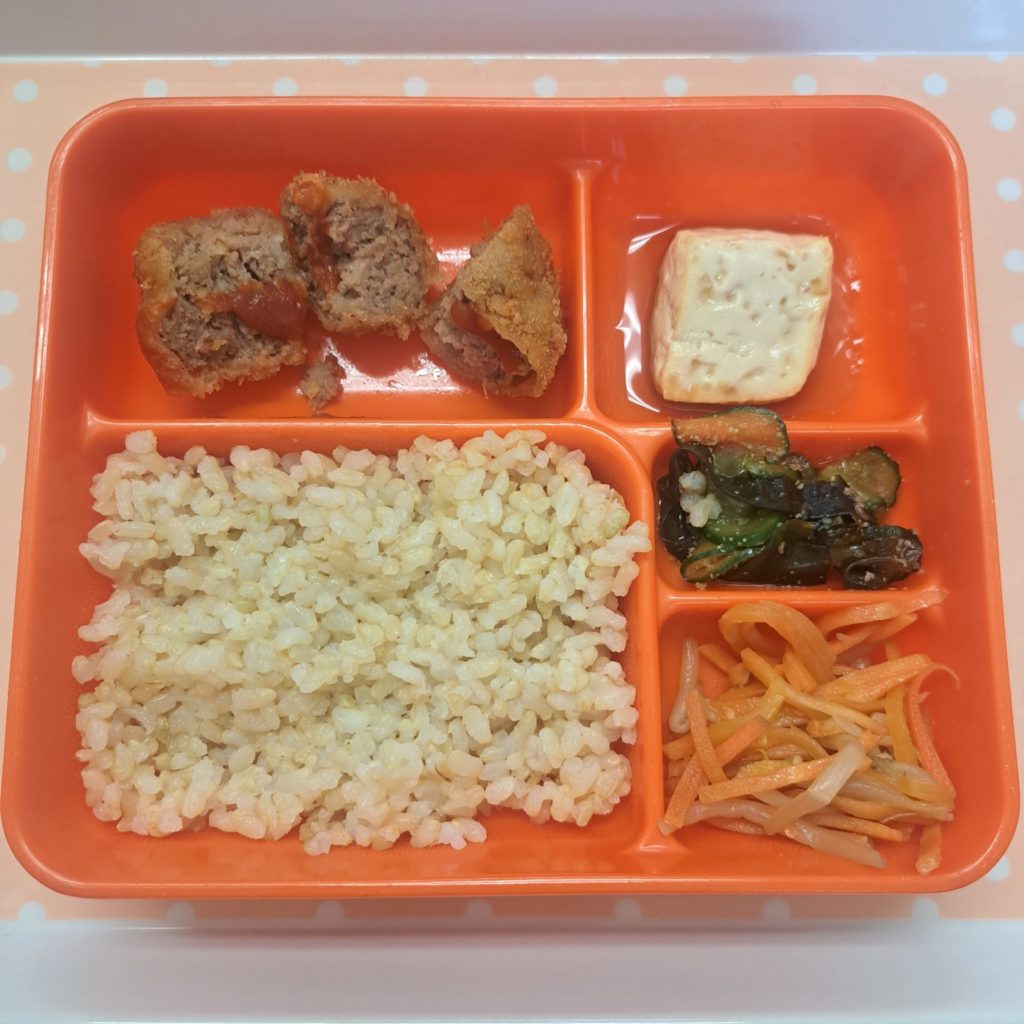 ★ミンチカツ、もやしと人参の和え物 豆腐ステーキ、ワカメときゅうりの和え物